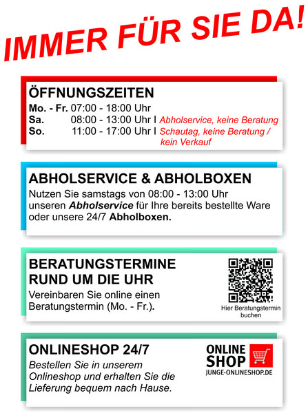 Nutzen Sie samstags von 8 bis 13 Uhr unseren Abholservice für Ihre bereits bestellte Ware oder unsere 24/7 Abholboxen auch außerhalb der Öffnungszeiten.